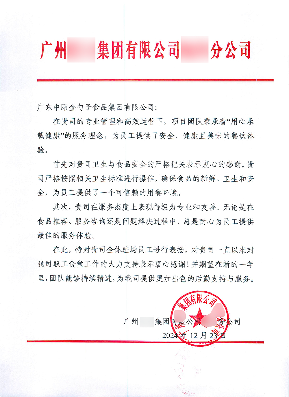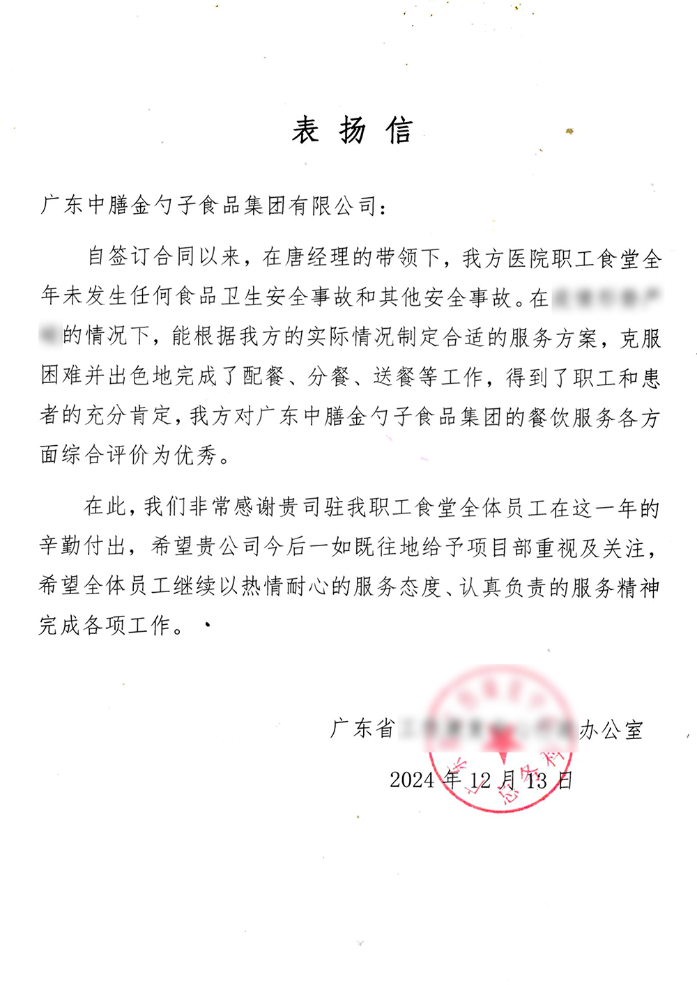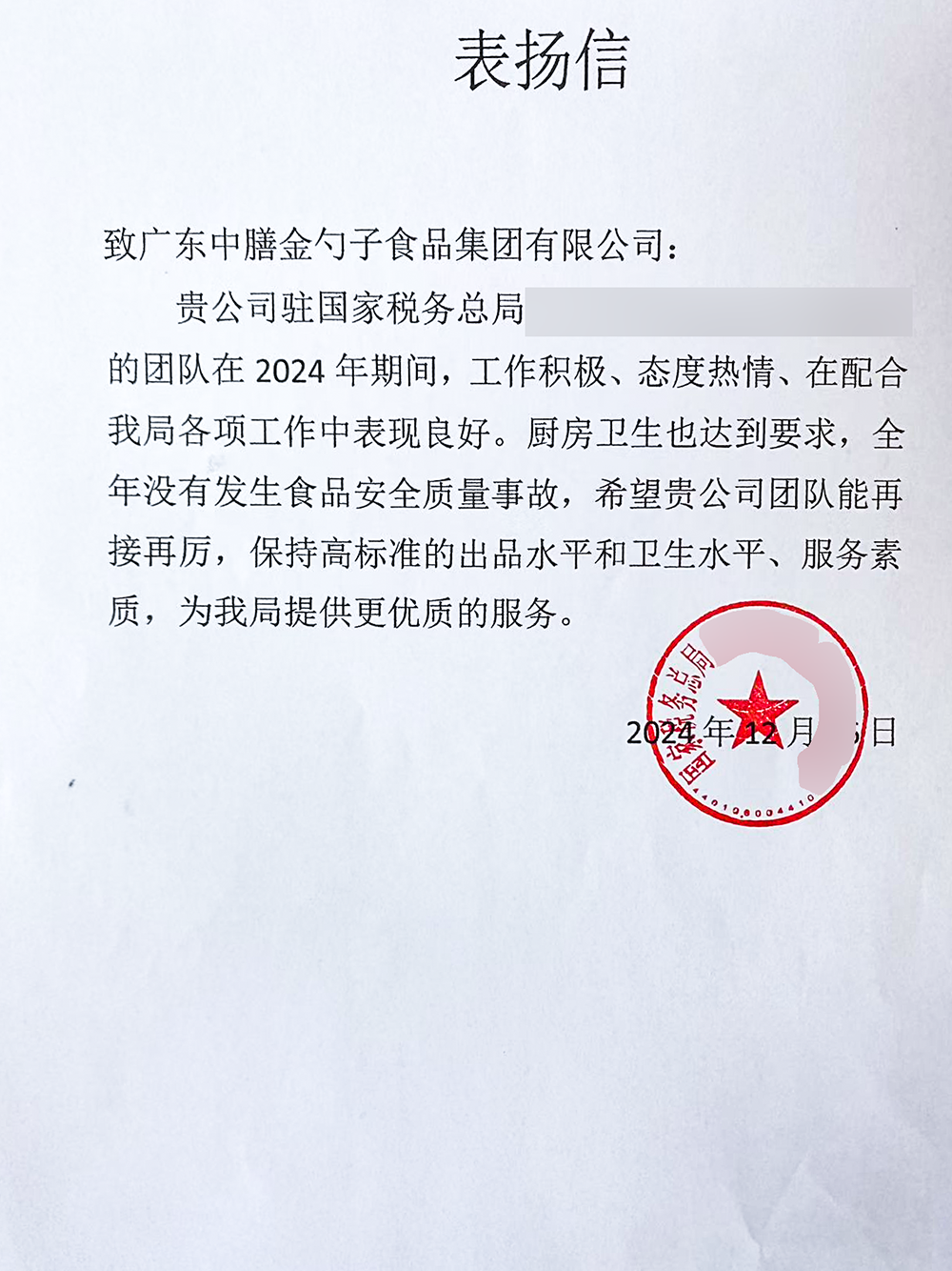 4、2024年3月,金勺子团餐337门店获泉州市市场监督管理局赞誉,食安管理成为地区示范标准。