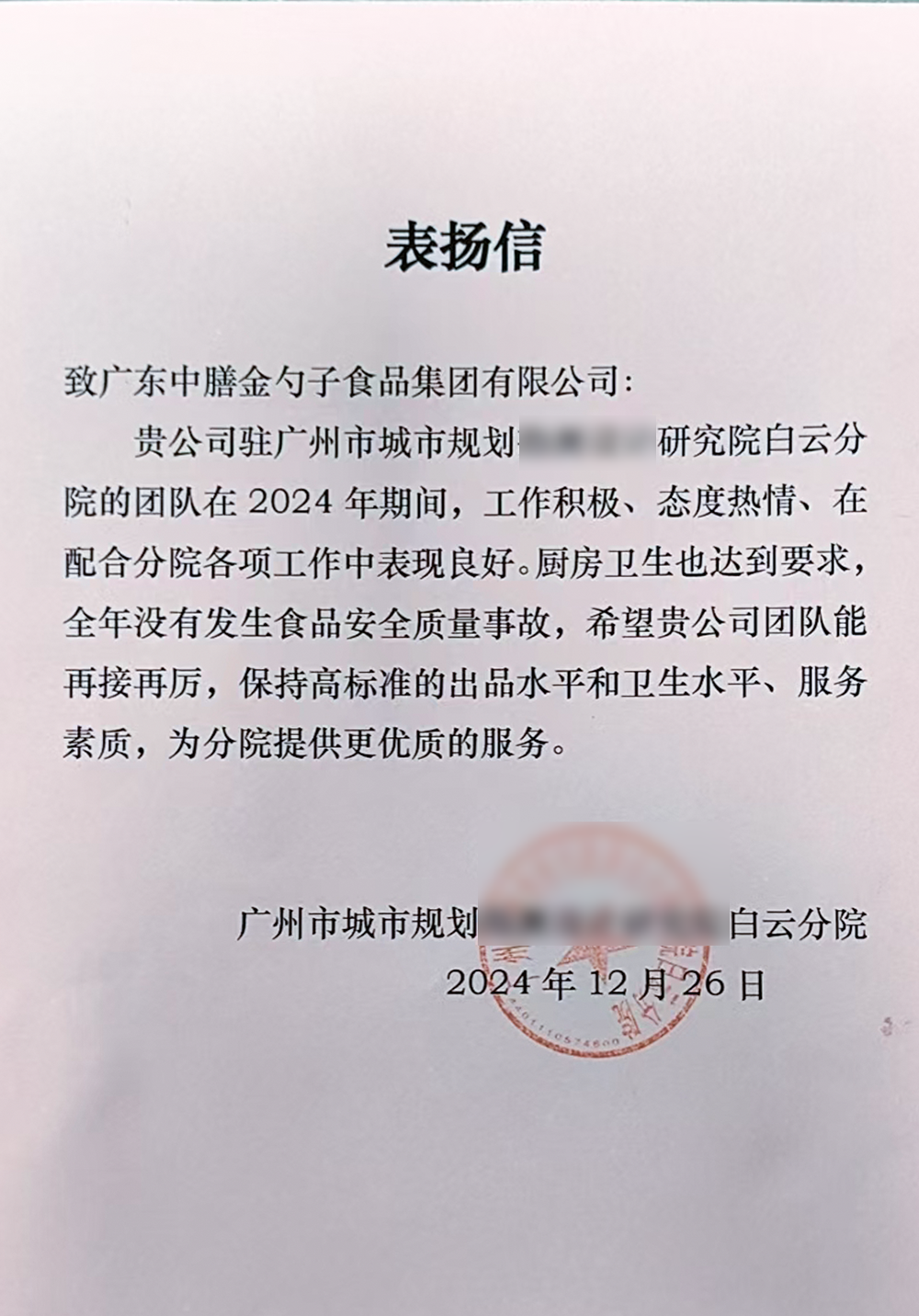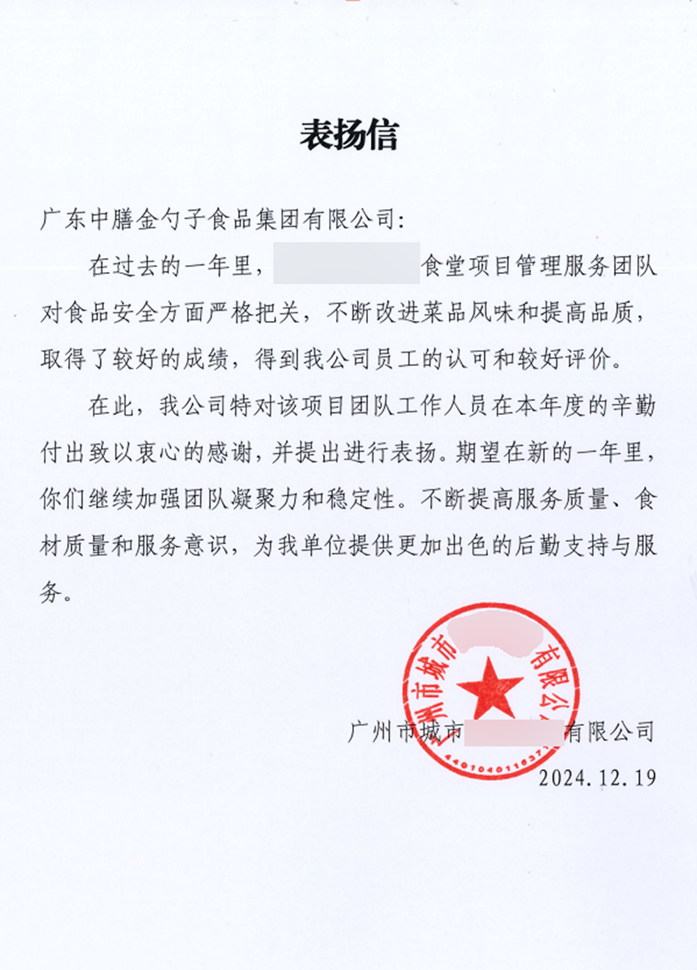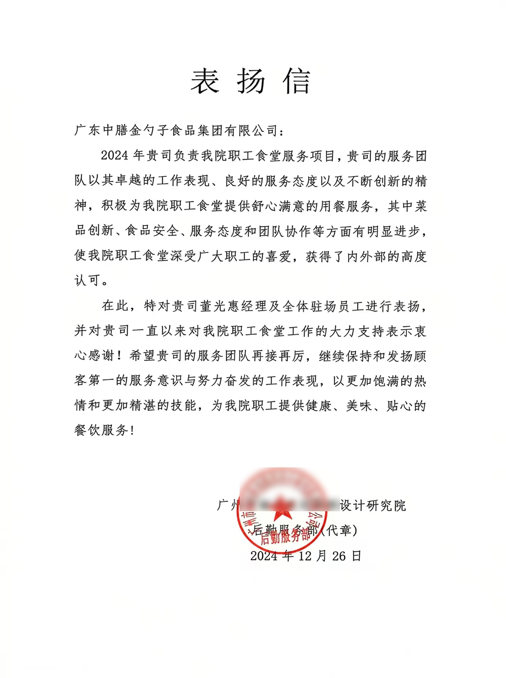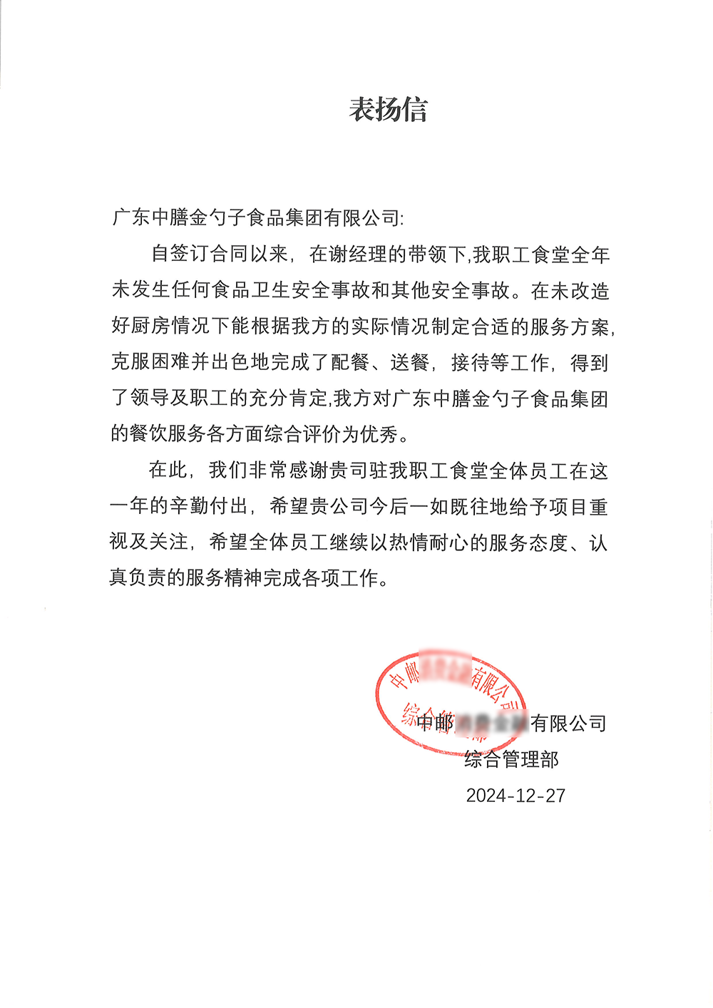 4、2024年3月,金勺子团餐337门店获泉州市市场监督管理局赞誉,食安管理成为地区示范标准。