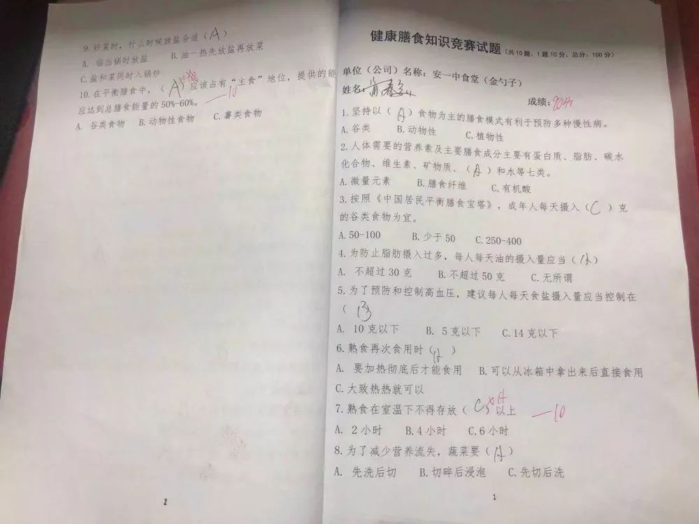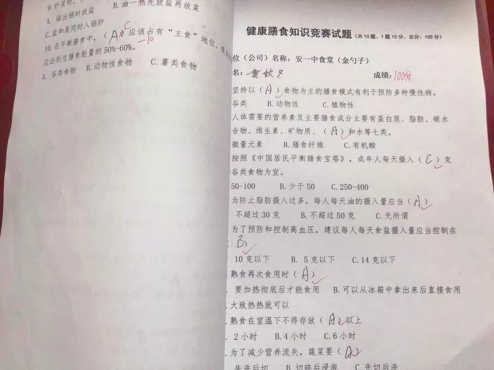 专家组对食堂员工培训开展工作情况进行查看验收。安溪一中食堂重视人才队伍的不断强化,食堂工作人员均需在公司内部接受培训方能到食堂上岗,食堂内部同时组织各项日常培训、厨师厨艺比赛以及员工培训考试,持续帮助食堂工作人员扩充知识储备与提升工作技能。