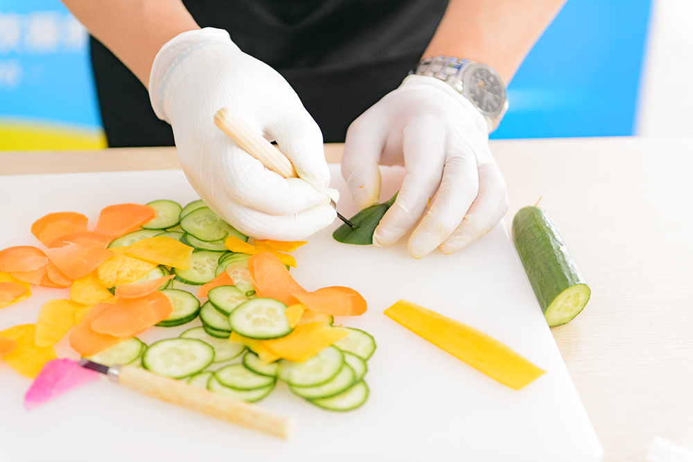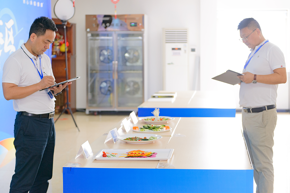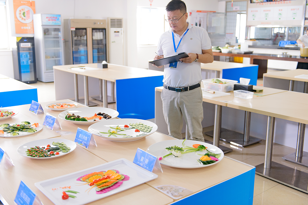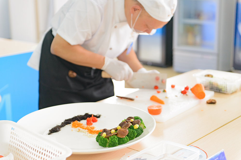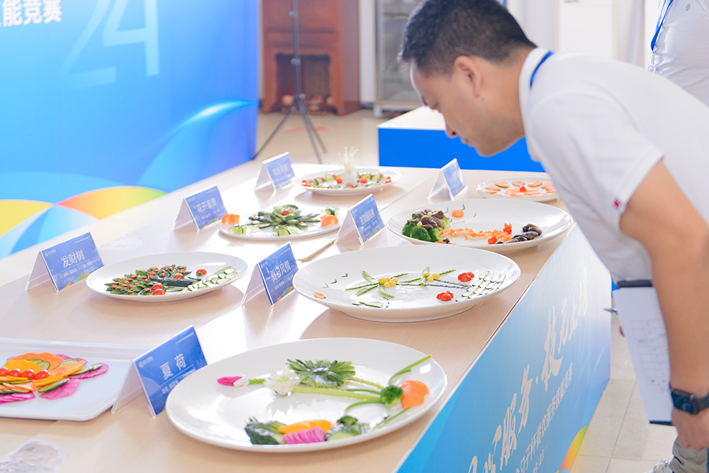 笔试结束后,素菜拼盘竞赛更加精彩纷呈。素菜拼盘比赛现场,参赛者们巧手翻飞,色彩丰富的蔬菜在他们的手中变成了一件件精美的艺术品。每一份拼盘都讲述着厨师们对美食的热爱,对生活的理解。