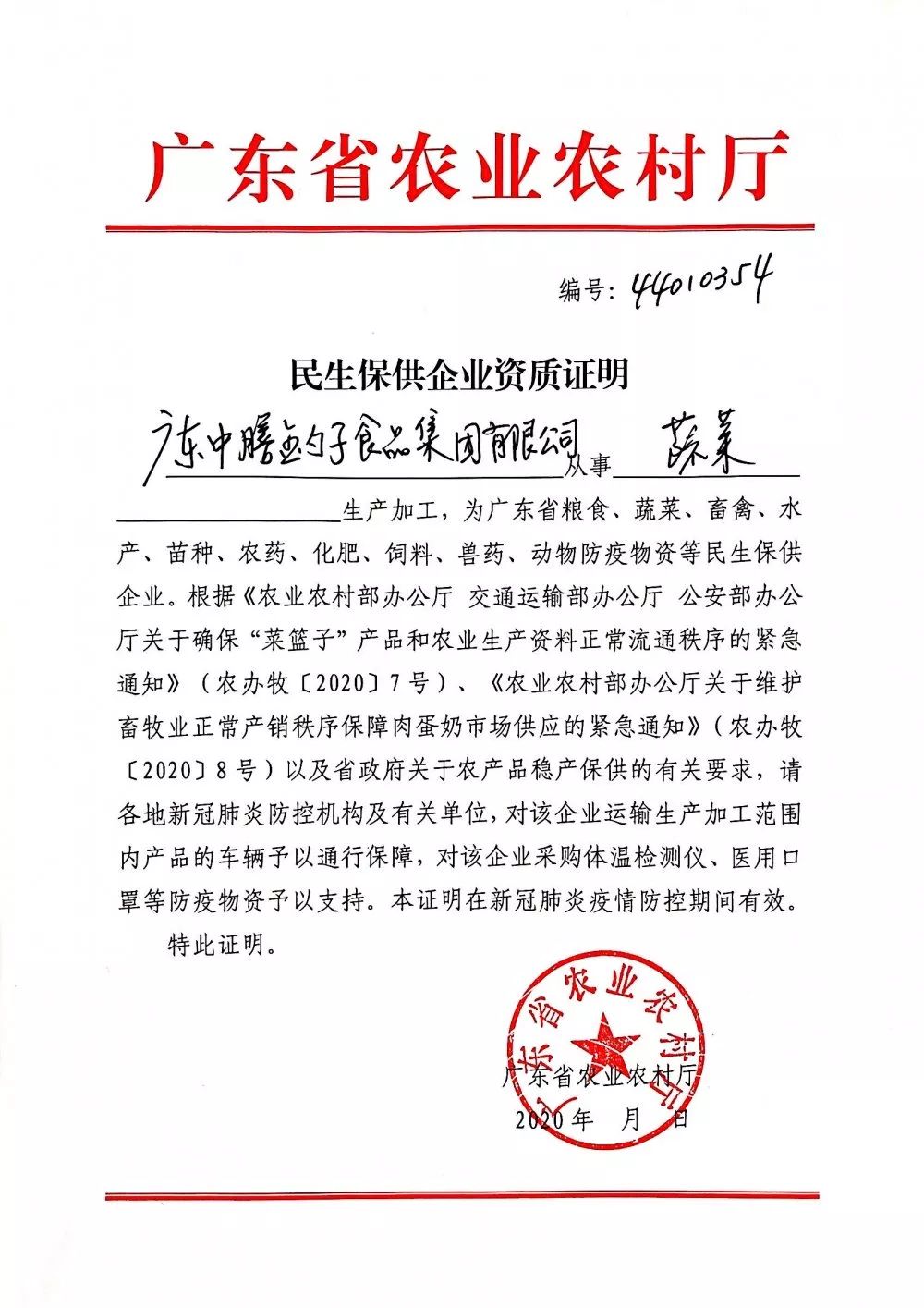 疫情期间,为落实民生保障工作,多地政府部门在行动。省农业农村厅为保障特殊时期农产品及农业生产资料有序流通,保证农产品有效供给,为农产品和农业生产资料加工企业,开具优先“绿色通道”证明!率先获得民生保供企业资质证明近日,中膳金勺子食品集团率先获得省农业农村厅开具的“民生保供企业资质证明”。证明显示:广